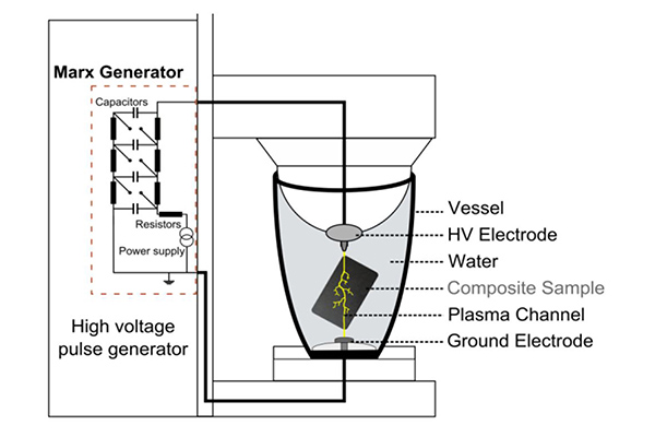 1、电碎裂处理:该方式是通过脉冲放电粉碎碳纤维复合材料,最初该方式开发应用于从采矿岩石中提取晶体和宝石。电碎裂处理过程中,将碳纤维复合材料先放置在装有水和两个电极的容器中,在电极之间产生的高压电脉冲 (50~200 kV) ,脉冲电压将材料破碎成更小的碎片。电碎裂处理可以与传统的机械处理方式对比,脉冲电压引发的破碎效果更好,可以产生更长、更清洁的纤维部分,但也存在一些劣势,如电碎裂的时间较长,能源消耗更大,而且可能对碳纤维造成一定的损伤,因此大规模应用的价值偏低。
