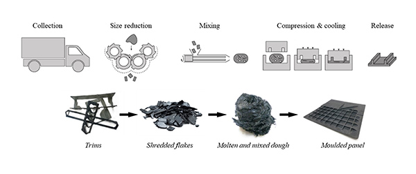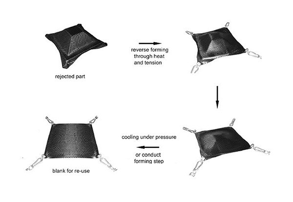 使用反向热成型来回收废物生产中产生的纤维增强热塑性复合材料层压板,主要过程是通过施加热量(红外辐射)和压力,将成型的热塑性碳纤维部件压平,获得热塑性碳纤维薄板,但该处理方式是有前提的,必须热塑性碳纤维部件中的碳纤维结构完好无损,否则压平后的薄板表面会出现褶皱等问题,影响外观和性能。