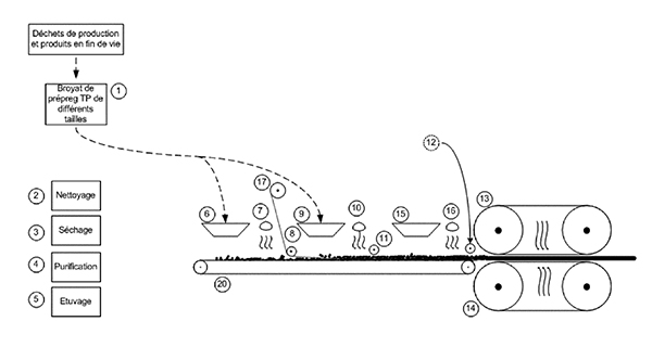 3、Thermosaïc®和Thermoprime®处理:该处理方式由法国阿尔萨斯研究中心CETIM-CERMAT开发并获得专利,是专门针对回收热塑性碳纤维复合材料的加工工艺。其中Thermosaïc®是通过热机械工艺对TPC制造废料进行重新评估,Thermoprime®则是与长纤维相关的再生热塑性塑料(例如PP或PA)的升级再造加工。前者是更科学更环保的将热塑性碳纤维复合材料破碎至理想状态,后者是将破碎的碳纤维复合材料重新聚合,聚合后的热塑性碳纤维复合材料将会得以新生,补偿老化和破碎部分的性能损失。目前已经有欧洲团队利用该处理方式,成功的回收了热塑性sjzc-复合材料,并用于相关产品的生产加工。