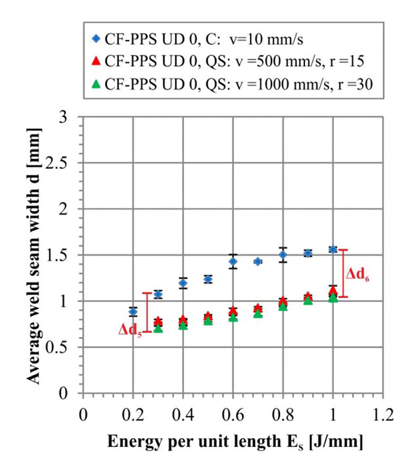 上图为0°纤维方向上,CF/PPS复合材料轮廓焊接(C)的和准同步焊接(QS),在每单位长度上施加的能量与平均焊缝宽度的图形数据对比。可以看出0°纤维方向上准同步焊接(QS)的焊缝宽度整体都小于轮廓焊接(C)。这是因为激光辐射透过CF/PPS复合材料后会出现冷却,多余的热量不足以熔化更多的基体材料,而是向辐射位置前后传导开来,因此焊缝宽度增加量很小,焊缝宽度级数之间的偏移几乎是恒定的(图中Δd5 ≈ Δd6 )。