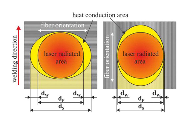3、规律C:激光焊接过程中,产生的热量高于基体熔化需求的热量,在0°和90°方向上,多余热量传导方向并不相同,造成的焊缝范围是有所区别的。0°纤维方向,热量往激光辐射位置前后传导,90°垂直纤维方向,热量往焊缝处传导,后者焊缝宽度更大。