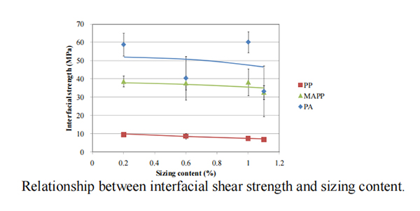 2、界面剪切强度与PP/MAPP:测试中对比了CF/PP、CF/MAPP和CF/PA这3种热塑性碳纤维,3种热塑性碳纤维的界面剪切强度都随着表面处理剂的增加而下降,界面剪切强度数据上从弱到强依次为:CF/PP、CF/MAPP和CF/PA。