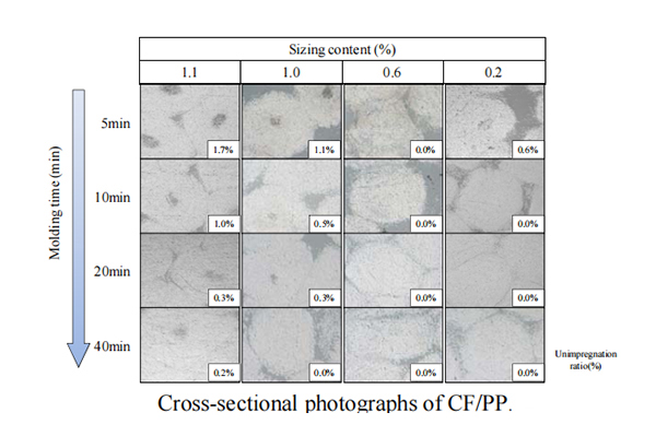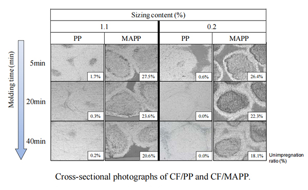 4、CF/PP和CF/MAPP浸入效果:上图中展示了CF/PP和CF/MAPP在不同成型时间下的横截面,CF/MAPP观察到比CF/PP更大的未浸渍区域,说明前者的浸润效果更差,但对应的界面剪切强度也更高。