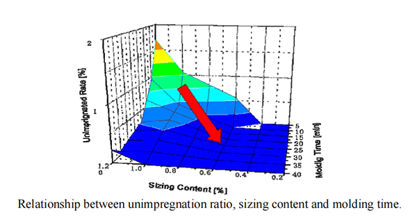 3、浸润效果与处理剂含量/成型时间:上图中所示,透明圆圈环状为树脂浸润碳纤维部分,圆圈中黑色区域为未浸润部分。表面处理剂含量1.1%,成型时间5分钟,观察到未浸润部分,随着成型时间逐步提升至40分钟,未浸润部分仍然存在,说明浸润不彻底。表面处理剂含量0.2%,成型时间5分钟,观察到未浸润部分,随着成型时间逐步提升至10分钟,黑色部分消失,说明充分浸润了碳纤维。浸润效果随着表面处理剂含量降低而提升,随着成型时间增加而提升。