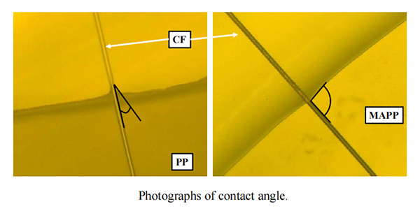 5、接触角和润湿能力:上图中展示了CF/PP和CF/MAPP的接触角,CF/MAPP的接触角高于CF/PP的接触角,表明使用马来化聚丙烯的润湿能力较差,对应的浸润效果也较差。