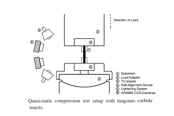 2、准静态测试:随机选择5个CF/PA6试样,使用机电试验机进行准静态测试,位移率为0.5mm/min,利用两个物体透镜,获得试样前表面的三维准静态应变场,采用数字图像相关软件计算应变数值,并制成压缩应力-应变响应曲线图。