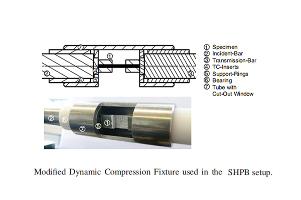 3、动态测试:随机选择5个CF/PA6试样,使用分裂霍普金森压力棒(SHPB)进行了高应变率动态测试,使用脉冲整形器提供一个三角形的弹性波,模拟接近实际工况的线性应力-应变行为失效的动态过程,使用高速摄像机监测试样变形和失效模式。