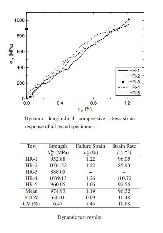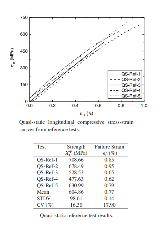 1、准静态测试结果:在恒定的位移速率下,加载5个试样直到失效,准静态测试的5个试样的纵向压缩应力-应变响应曲线如上图所示。每条曲线的终点表示失效载荷,并与准静态纵向抗压强度 Xqs C 和最终的失效应变 εu C 相关,5个试样的平均纵向压缩强度为604.86MPa。