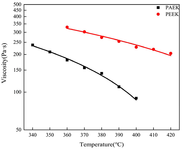 1、PEAK和PEEK树脂粘性-温度曲线:上图为PEAK和PEEK树脂粘性-温度曲线图,数据显示PAEK在340℃~400℃下的粘度约为89~237Pa·s,PEEK在360℃~420℃下的粘度为203~330Pa·s。两种热塑性树脂都具有剪切稀化行为,粘度随温度升高而降低。树脂熔体的粘度越低,扩散越好,对界面结合强度的正向影响越大。