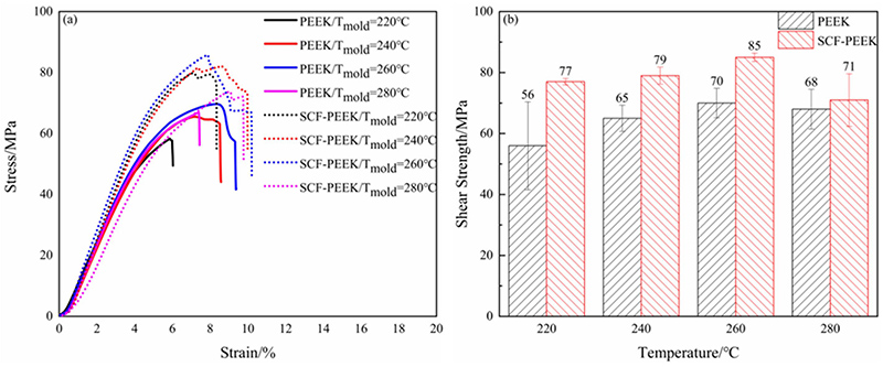 2、不同模具温度下包覆成型复合材料的剪切强度:上图a为PEEK和SCF-PEEK这两种材料在不同模具温度下的应力-应变曲线,上图b为PEEK/CCF-PAEK和SCF-PEEK/CCF-PAEK在不同模具温度下的剪切强度数据,PEEK/CCF-PAEK的剪切强度分别为56MPa、65MPa、70MPa和68MPa,而SCF-PEEK/CCF-PAEK的剪切强度为77MPa、79MPa、85MPa和71MPa。