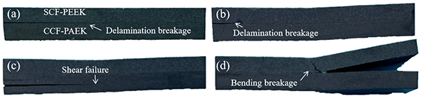 上图为SCF-PEEK/CCF-PAEK包覆复合材料在不同模具温度下的试样剪切破坏截面图,试样状态与PEEK/CCF-PAEK包覆复合材料相似。当模具温度为220℃和240℃时,界面结合失效依然是主要问题(上图a和b);当模具温度升高到260℃和280℃时;SCF-PEEK/CCF-PAEK的失效为CCF-PAEK的层间断裂和SCF-PEEK的弯曲失效(上图c和d)。由于包覆成型产生的弯曲变形和层间剪切变形,当界面结合强度减弱时,PEEK、SCF-PEEK和CCF-PAEK之间会发生分层。随着界面结合强度的增加,复合材料的界面分层逐渐减少,树脂的层间断裂增加。