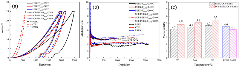 当压痕深度较小时,模量随着压痕深度的增加而迅速减小(上图b),且此时模量曲线变化较多。深度超过250nm后,模量值随着深度的增加逐渐变得平滑。当压痕深度超过500nm时,模量曲线变得平滑。当模具温度为220℃时,PEEK/CCF-PAEK包覆复合材料的深度-模量曲线比较不稳定,此时的模量较低,为4.2GPa,表明熔体在260℃的模具温度下可以与瓶坯表面树脂形成树脂共生层,因此具有与PEEK相同的模量。