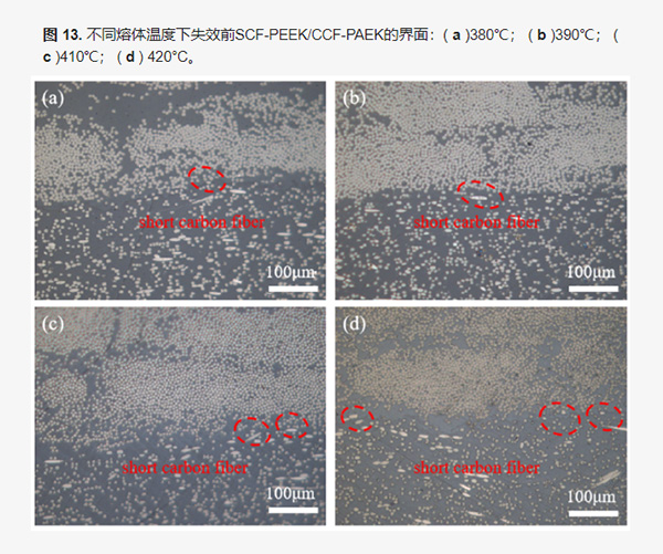2、不同熔融温度下SCF-PEEK/CCF-PAEK试样界面结合效果:上图显示了SCF-PEEK/CCF-PAEK复合材料在不同熔融温度下的界面结合状态,当模具温度为260℃时,PAEK和PEEK之间的边界变得不清晰。随着熔体温度升高,SCF-PEEK中越来越多的短碳纤维进入PAEK树脂中。上图中红圈所示,短碳纤维跨越边界连接两种基体树脂,提高界面结合强度。当界面处形成树脂共混区时,可以通过提高熔融温度来改善SCF-PEEK树脂的流动性。可以将更多短碳纤维插入富含树脂的区域以增强界面。