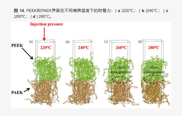 如上图显示,事先将PAEK树脂涂成棕色,将PEEK树脂涂成绿色,通过电子扫描显微镜观察两种热塑性复合材料包覆成型的具体过程,观察分子间扩散和界面形成过程。结果表明,模具温度显著影响界面结合强度,而熔体温度几乎没有影响。因此将实验中模具温度作为模拟观察的核心因素,设定注塑温度设定为400℃,模具温度分别设定为220℃、240℃、260℃、280℃。数据显示,随着模具温度的升高,一些分子链穿过界面并与另一层分子链纠缠在一起。在PEEK/PAEK两种热塑性复合材料包覆成型中,界面的形成不仅取决于两个分子链的相互运动,还取决于分子的自运动。