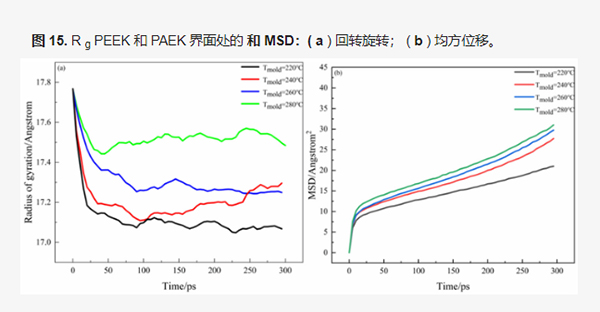 上图a显示了PAEK和PEEK这两种树脂界面结合处不同模具温度下的旋转半径,在不同的加工条件下,当达到300℃的稳定状态时,整个系统的旋转半径逐渐增大。上图b显示了PEEK和PAEK这两种树脂界面结合处不同模具温度下的平均方位角位移-时间曲线。总平均方位角偏移随时间迅速增加,表明随着温度升高,分子运动加快,界面结合强度获得提升。但当温度超过280℃后,平均方位值偏移量趋于平稳,界面结合强度也停止了增加。