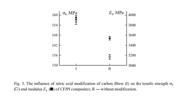 如上图所示,将硝酸氧化处理的热塑性CF/TPI复合材料,与未经氧化处理的热塑性CF/TPI复合材料进行对比,前者的抗拉强度和拉伸模量分别比后者提高了约28%和10%。从数据上可以直观的发现,经过硝酸氧化处理有效提高了碳纤维与热塑性树脂之间的兼容性和界面粘结性能,从而提高了复合材料的抗拉强度。