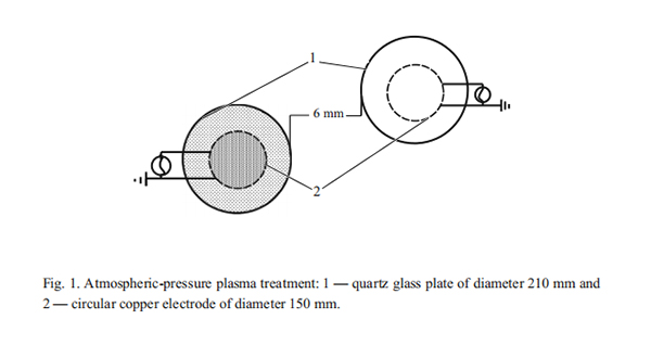 1、等离子体处理:使用在空气中操作的介质阻挡放电(DBD),如上图所示。将两个直径为150mm的圆形铜电极放置在DBD等离子体配置中,每个电极均覆盖有厚度为2mm、直径为210mm的圆形石英玻璃板,石英玻璃板间隙为6mm。将碳纤维放置在下方石英玻璃板上,电源提供8kV电压和8kHz频率的脉冲型交流电,放电过程中,上电极产生的大量致密细丝状微放电轰击纤维表面。等离子体处理的持续时间分别为30秒、60秒和120秒。