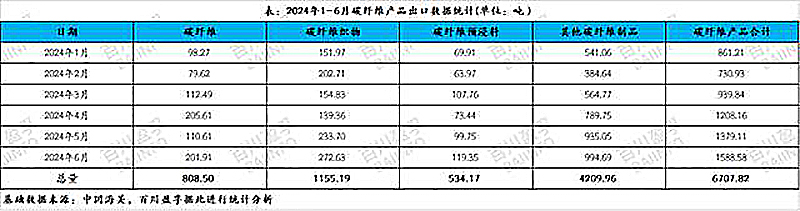 2024年6月我国出口碳纤维201.91吨,出口碳纤维织物272.63吨,出口碳纤维预浸料119.35吨,出口其他碳纤维制品994.69吨,出口碳纤维产品合计1588.58吨。