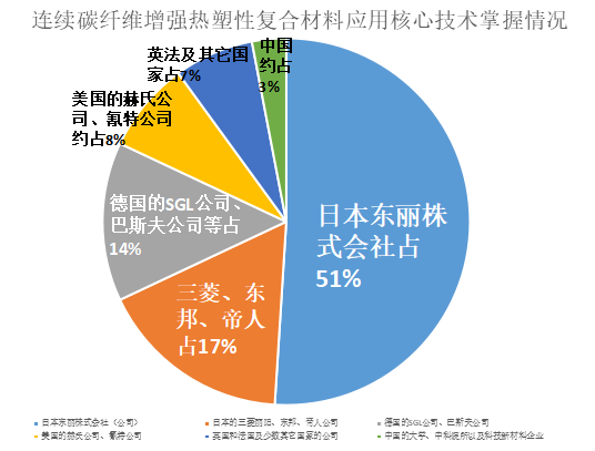从这些专利数据可知,51%的连续性碳纤维增强热塑性复合材料的核心应用技术都掌握在日本东丽株式会社(公司)手中;日本的三菱丽阳、东邦、帝人公司约占17%;德国的SGL公司、巴斯夫公司等约占14%;美国的赫氏公司、氰特公司等约占8%;英国和法国及少数其它国家的公司约占有7%;而中国的大学、中科院所以及科技新材料企业所占有的核心专利数量仅有3%。